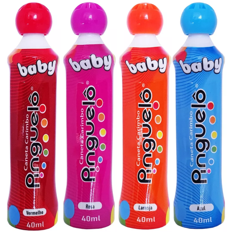 O Segundo Tipo De Caneta, Que são as mais recentes, São Formado Pelas Canetas Pinguelô Baby, Essas Ocupam Um Carinho Maior pelo Público mais Infantil, Mais Focadas Para Desenhos e Entretenimento. A Caneta Carimbo Pinguelô Baby contém 40ml, com a ponta de feltro de10mm, seu tamanho é de aproximadamente 13,4 cm de altura por 3 de largura.