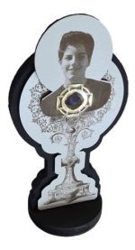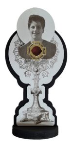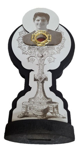 Relicario de Carlos Acutis, acompanha teca com o objetivo de armazenar reliquis de santos. perfeito para decoração de ambientes e símbolo de devoção.